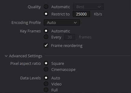 Set the Quality option to Restrict, and set it to 25,000 Kb/s. This will allow DaVinci Resolve to export the video using 25 Mb/s. This depends on your project's resolution and frame rate, as well as the format if you choose something other than MP4. For a 1920x1080 resolution video in 30 FPS, 25 Mb/s should suffice. However, for 4K or fast-paced footage like GoPro videos or gameplay, increase the quality option to around 60 Mb/s.